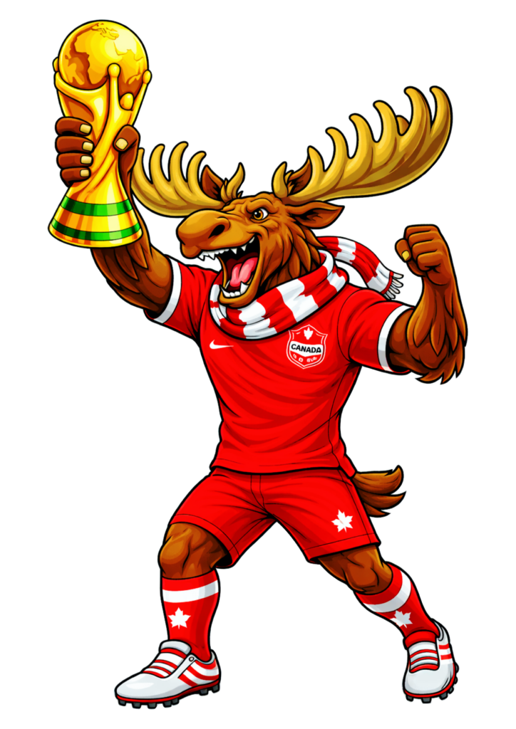 World cup 2026 Canadian soccer mascot Moose wearing uniform and holding a trophy decoration image printable cartoon png