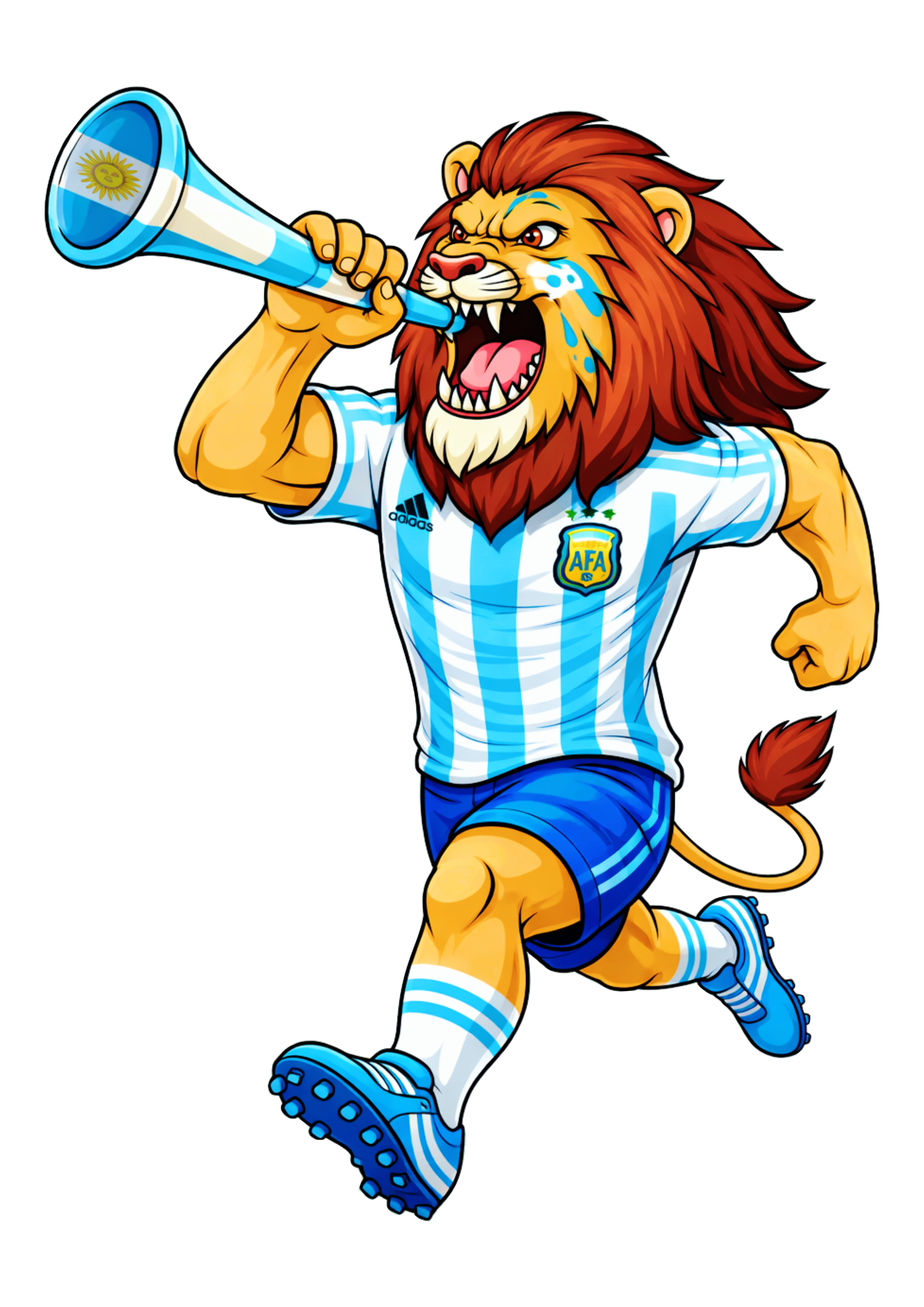 Mascote argentino leão usando uniforme segurando uma vuvuzela campeão imagem para decoração copa do mundo 2026 png