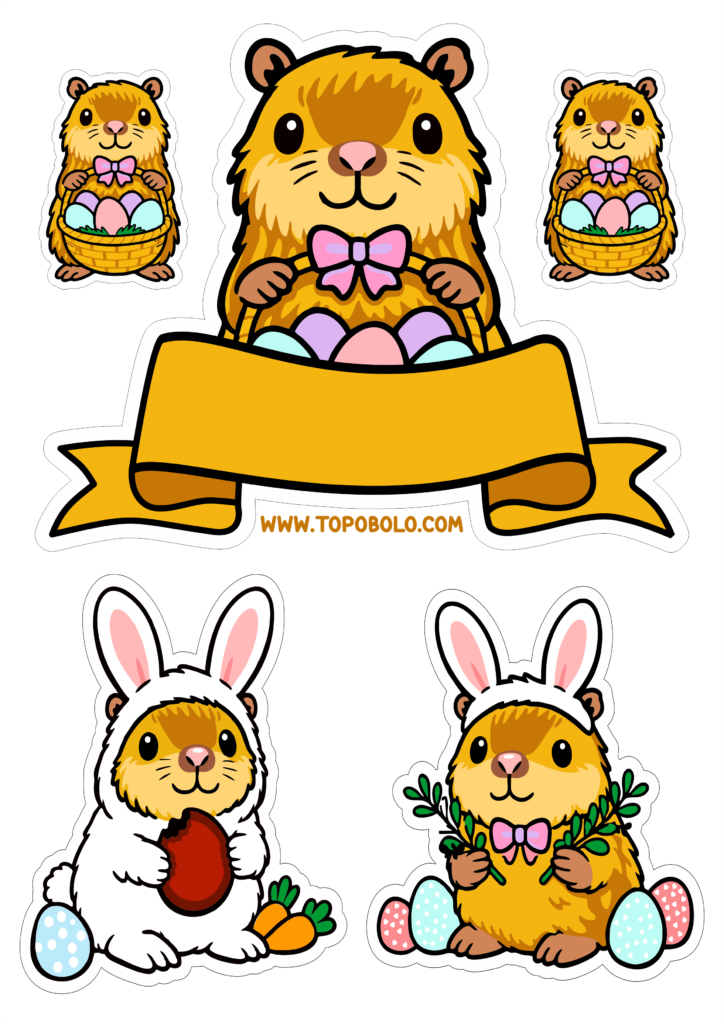 Topo de bolo com imagens fofinhas de páscoa capivara e ovos de chocolate decoração para festa infantil png